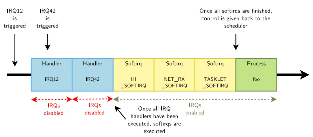 中断处理程序需快速执行,因此内核将中断处理分为上半部(Hard IRQ)与下半部(Bottom Half),拆分耗时逻辑: