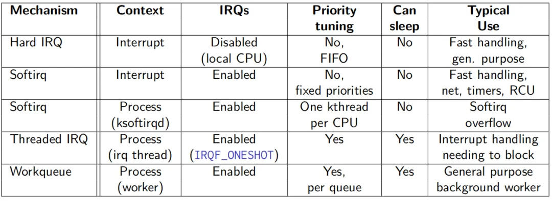 下半部:运行在进程/软中断上下文,处理耗时操作(如数据拷贝、协议解析、I/O操作),允许睡眠与调度,内核提供三种下半部实现: