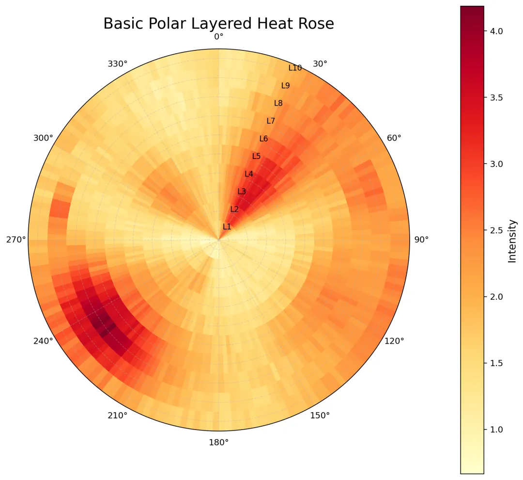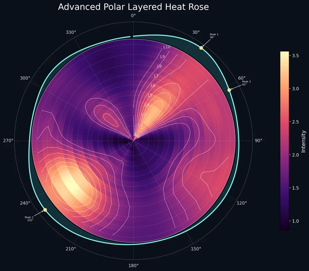 import osimport numpy as npimport matplotlib.pyplot as pltfrom matplotlib.colors import LinearSegmentedColormap# 0. 输出目录OUTDIR = "polar_rose_output"os.makedirs(OUTDIR, exist_ok=True)# 1. 构造模拟数据def ang_diff_deg(a, b): """计算角度差(单位:度),结果限制在 [-180, 180]""" return (a - b + 180) % 360 - 180def gaussian_ang(theta_deg, mu_deg, sigma_deg): d = ang_diff_deg(theta_deg, mu_deg) return np.exp(-0.5 * (d / sigma_deg) ** 2)def generate_polar_layer_data(n_theta=180, n_r=10, seed=2026): """ 构造“方向-层级-强度”三维数据 theta: 方向 r: 层级 Z: 每个方向-层级组合对应的强度 """ rng = np.random.default_rng(seed) theta_centers = np.linspace(0, 360, n_theta, endpoint=False) # degree r_centers = np.arange(1, n_r + 1) T, R = np.meshgrid(theta_centers, r_centers) # 多个方向主峰 peak1 = 1.8 * gaussian_ang(T, 35, 18) * (0.65 + 0.35 * np.exp(-((R - 3.0) / 2.2) ** 2)) peak2 = 1.5 * gaussian_ang(T, 120, 26) * (0.45 + 0.55 * np.exp(-((R - 6.5) / 1.8) ** 2)) peak3 = 1.9 * gaussian_ang(T, 235, 20) * (0.35 + 0.75 * np.exp(-((R - 8.0) / 1.5) ** 2)) peak4 = 1.2 * gaussian_ang(T, 310, 15) * (0.60 + 0.40 * np.exp(-((R - 4.0) / 1.7) ** 2)) # 条带型起伏 band = 0.35 * (1 + np.cos(np.deg2rad(2.2 * T - 18 * R))) wave = 0.25 * (1 + np.sin(np.deg2rad(1.3 * T + 25 * R))) # 径向趋势 radial_trend = 0.15 + 0.08 * R + 0.12 * np.exp(-((R - 5.5) / 3.2) ** 2) # 局部热点 hotspot = ( 0.9 * gaussian_ang(T, 70, 8) * np.exp(-((R - 8.5) / 0.9) ** 2) + 0.8 * gaussian_ang(T, 205, 10) * np.exp(-((R - 2.5) / 0.8) ** 2) + 1.1 * gaussian_ang(T, 280, 7) * np.exp(-((R - 9.0) / 0.7) ** 2) ) noise = 0.08 * rng.normal(size=(n_r, n_theta)) Z = peak1 + peak2 + peak3 + peak4 + band + wave + radial_trend + hotspot + noise Z = np.clip(Z, 0, None) return theta_centers, r_centers, Z# 2. 平滑函数def circular_smooth_along_theta(Z, kernel_size=11, sigma=2.8): """ 对角度方向做环形平滑 Z shape = (n_r, n_theta) """ x = np.arange(kernel_size) - kernel_size // 2 kernel = np.exp(-0.5 * (x / sigma) ** 2) kernel /= kernel.sum() pad = kernel_size // 2 Z_pad = np.concatenate([Z[:, -pad:], Z, Z[:, :pad]], axis=1) out = np.zeros_like(Z) for i in range(Z.shape[0]): out[i] = np.convolve(Z_pad[i], kernel, mode="valid") return outdef smooth_along_radius(Z, kernel_size=5, sigma=1.1): """ 对径向做一维平滑 """ x = np.arange(kernel_size) - kernel_size // 2 kernel = np.exp(-0.5 * (x / sigma) ** 2) kernel /= kernel.sum() pad = kernel_size // 2 Z_pad = np.pad(Z, ((pad, pad), (0, 0)), mode="edge") out = np.zeros_like(Z) for j in range(Z.shape[1]): out[:, j] = np.convolve(Z_pad[:, j], kernel, mode="valid") return out# 3. 找主方向峰值def find_top_direction_peaks(theta_deg, profile, min_sep_deg=22, top_k=3): """ 在方向强度曲线上找几个主峰,避免彼此过近 """ idx_sorted = np.argsort(profile)[::-1] chosen = [] for idx in idx_sorted: ang = theta_deg[idx] good = True for c in chosen: if abs(ang_diff_deg(ang, theta_deg[c])) < min_sep_deg: good = False break if good: chosen.append(idx) if len(chosen) >= top_k: break return chosen# 4. 作图:基础版def plot_basic(theta_deg, r_centers, Z, out_png): fig = plt.figure(figsize=(9, 9), dpi=220) ax = plt.subplot(111, projection="polar") # 构造边界 theta_edges = np.linspace(0, 2 * np.pi, len(theta_deg) + 1) r_edges = np.arange(0.5, len(r_centers) + 1.5, 1.0) mesh = ax.pcolormesh( theta_edges, r_edges, Z, cmap="YlOrRd", shading="auto" ) ax.set_theta_zero_location("N") ax.set_theta_direction(-1) ax.set_rlim(0.5, len(r_centers) + 0.5) ax.set_thetagrids( np.arange(0, 360, 30), labels=[f"{d}°" for d in range(0, 360, 30)], fontsize=10 ) ax.set_rgrids( np.arange(1, len(r_centers) + 1), angle=22.5, labels=[f"L{i}" for i in range(1, len(r_centers) + 1)], fontsize=9 ) ax.grid(alpha=0.35, linestyle="--", linewidth=0.7) ax.set_title("Basic Polar Layered Heat Rose", fontsize=18, pad=24) cbar = plt.colorbar(mesh, ax=ax, pad=0.10, shrink=0.88) cbar.set_label("Intensity", fontsize=12) plt.tight_layout() plt.savefig(out_png, bbox_inches="tight", facecolor="white")# 5. 作图:进阶版def plot_advanced(theta_deg, r_centers, Z, out_png): # 平滑后的热力场 Zs = circular_smooth_along_theta(Z, kernel_size=13, sigma=3.0) Zs = smooth_along_radius(Zs, kernel_size=5, sigma=1.0) # 方向积分强度,用于外环曲线 dir_profile = Zs.sum(axis=0) # 角度转弧度 theta = np.deg2rad(theta_deg) theta_edges = np.linspace(0, 2 * np.pi, len(theta_deg) + 1) r_edges = np.arange(0.5, len(r_centers) + 1.5, 1.0) # 自定义漂亮一点的配色 colors = ["#14001f", "#3b0f70", "#8c2981", "#de4968", "#fe9f6d", "#fcfdbf"] cmap_adv = LinearSegmentedColormap.from_list("custom_rose", colors, N=256) fig = plt.figure(figsize=(10, 10), dpi=240, facecolor="#0b0f1a") ax = plt.subplot(111, projection="polar", facecolor="#0b0f1a") # 主热力图 mesh = ax.pcolormesh( theta_edges, r_edges, Zs, cmap=cmap_adv, shading="auto" ) # 叠加等值线 tt, rr = np.meshgrid(theta, r_centers) levels = np.linspace(np.percentile(Zs, 50), np.percentile(Zs, 96), 7) cs = ax.contour( tt, rr, Zs, levels=levels, colors="white", linewidths=0.75, alpha=0.62 ) # 外环方向强度曲线 prof_norm = (dir_profile - dir_profile.min()) / (dir_profile.max() - dir_profile.min() + 1e-12) outer_base = len(r_centers) + 0.65 outer_curve = outer_base + 1.15 * prof_norm ax.plot(theta, outer_curve, color="#8ef9f3", lw=2.4, alpha=0.98) ax.fill_between(theta, outer_base, outer_curve, color="#38d9d9", alpha=0.16) # 标出主方向峰值 peak_ids = find_top_direction_peaks(theta_deg, dir_profile, min_sep_deg=26, top_k=3) for i, idx in enumerate(peak_ids, 1): ang = theta[idx] rr_peak = outer_curve[idx] deg = theta_deg[idx] ax.scatter( [ang], [rr_peak], s=55, c="#ffe66d", edgecolors="white", linewidths=0.8, zorder=8 ) r_text = rr_peak + 1.45 if 0 <= deg < 90: ha = "left" elif 90 <= deg < 180: ha = "left" elif 180 <= deg < 270: ha = "right" else: ha = "right" ax.annotate( f"Peak {i}\n{deg:.0f}°", xy