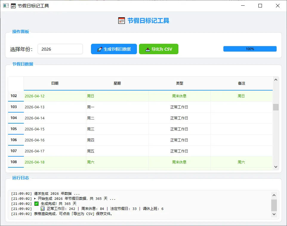 今天我们就用 Python + PyQt5 + chinese-calendar 库,打造一个带图形界面的「节假日标记工具」,选好年份点一下就能生成全年数据,还能一键导出 CSV 文件。