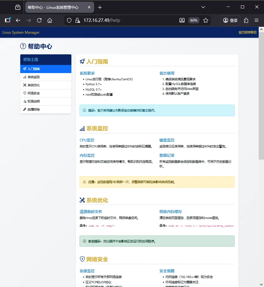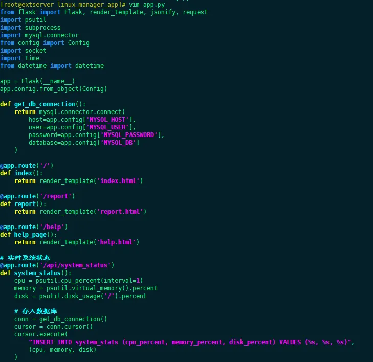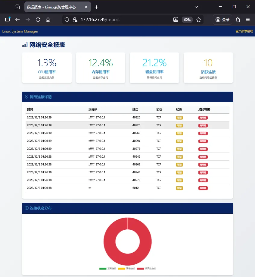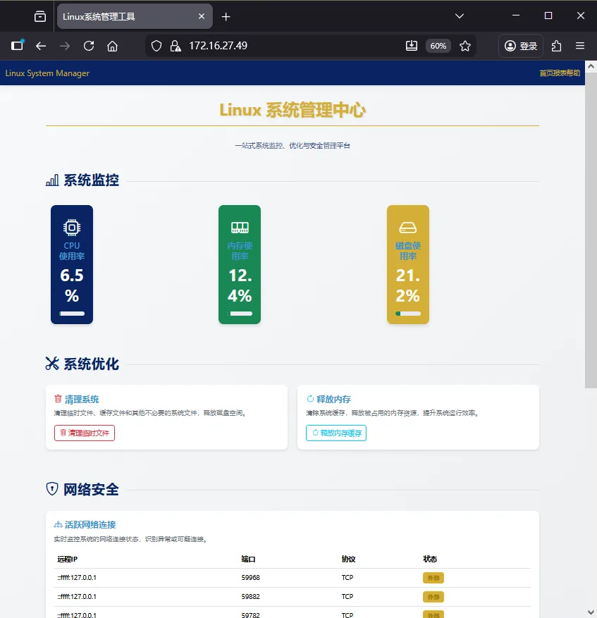 摘要:本文提出并实现了一套基于 Python Flask 的可视化 Linux 系统管理工具,通过图形界面封装底层命令行操作,降低运维复杂度。系统涵盖实时监控、垃圾清理、内存释放、网络连接分析、软件包管理及基础安全防护等功能,并利用 MySQL 实现状态数据与操作日志的持久化存储。前端采用 Bootstrap 5 构建响应式界面,支持 HTTPS 安全访问。文章不仅详细列出完整代码和数据库设计,还提供了可落地的部署方案,帮助开发者和运维人员高效、直观地管理 Linux 系统。