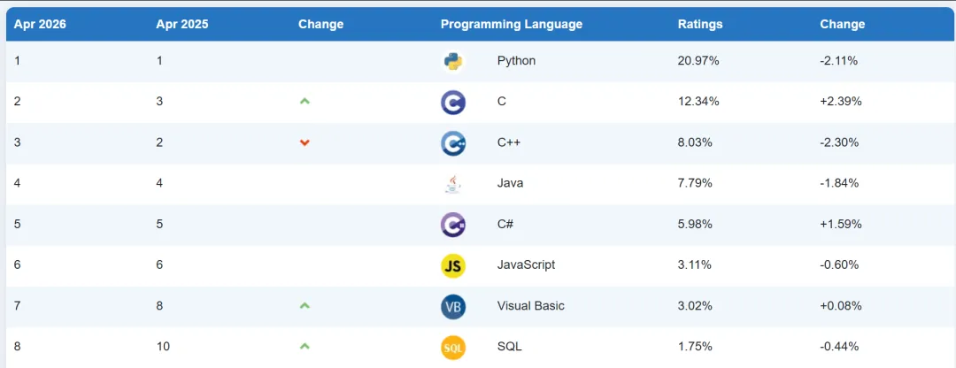 Python还是最常用,但份额下滑说明它在某些高性能场景被C和C#抢了部分位置。C语言这次明显回暖,可能跟AI硬件优化和系统级开发需求有关。