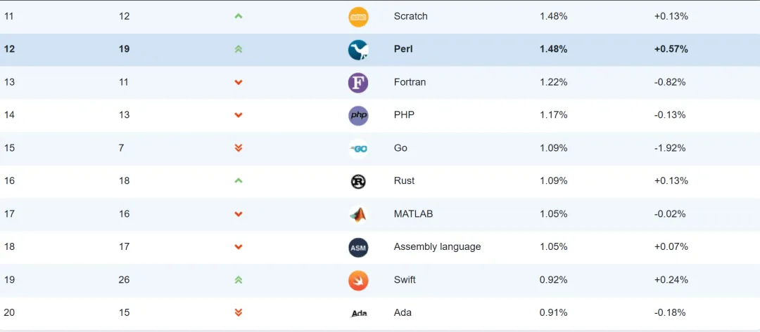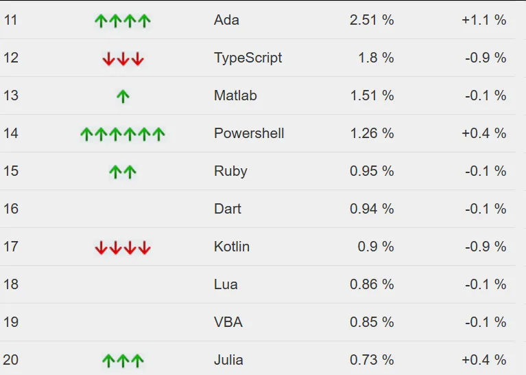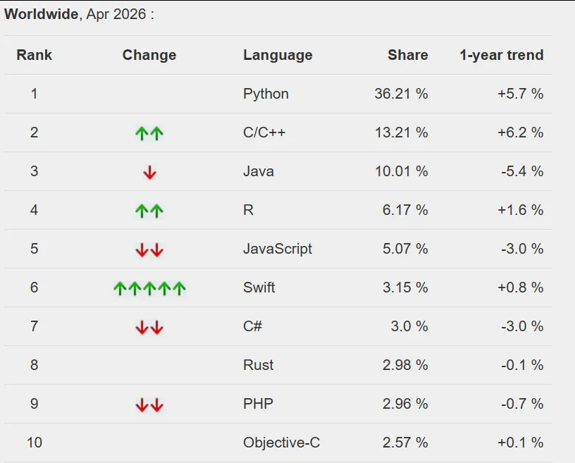 Rust排到第16位(1.09%),感觉上升势头在放缓——它2026年初最高冲到13位,现在掉下来,可能是因为学习门槛高,难大规模普及。