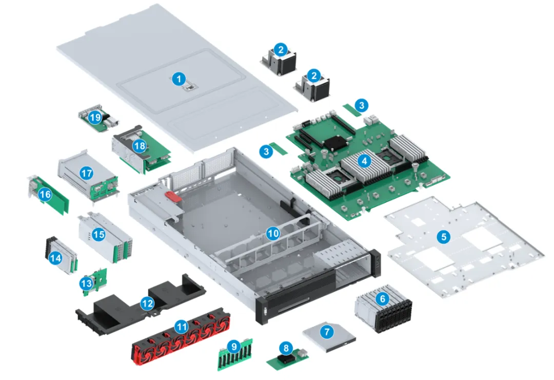 | 4.内存条 | 9.前置硬盘背板 | 14.硬盘 | 19.板载网卡 |