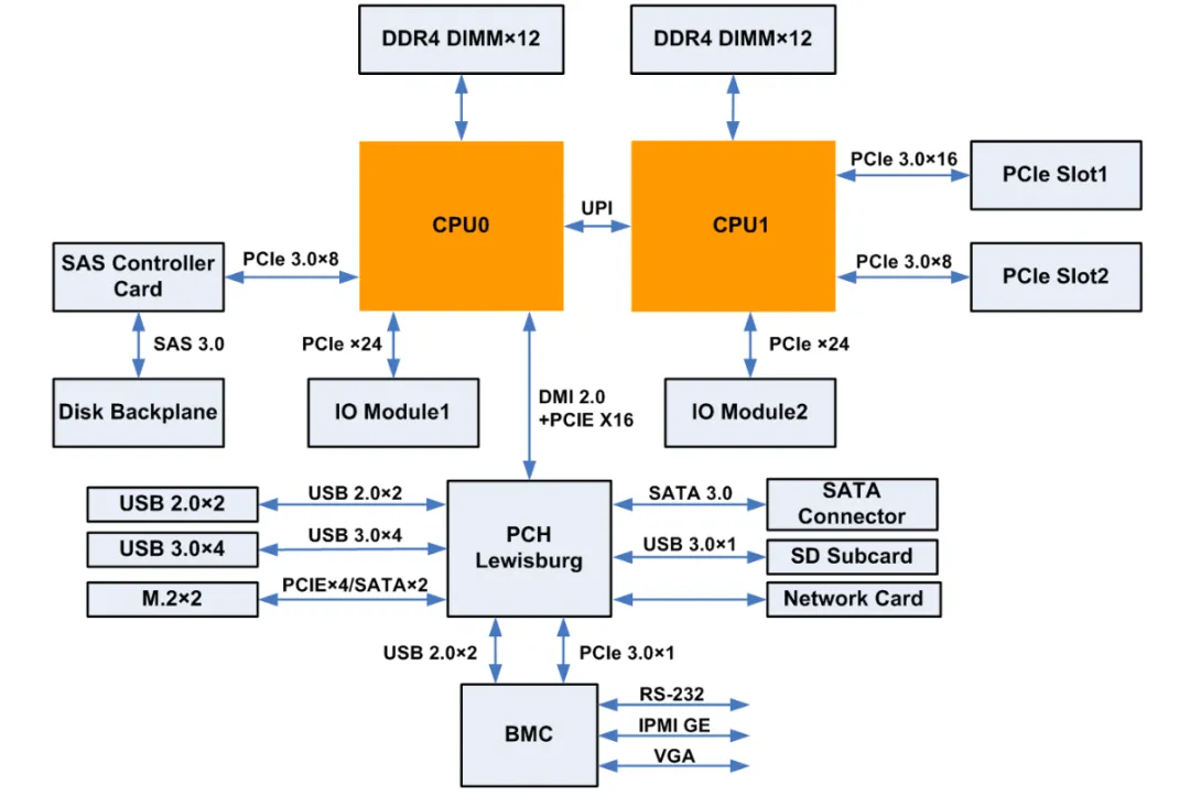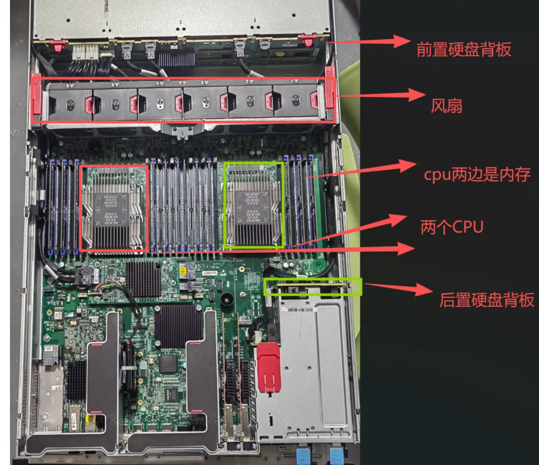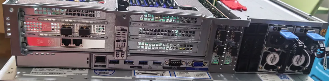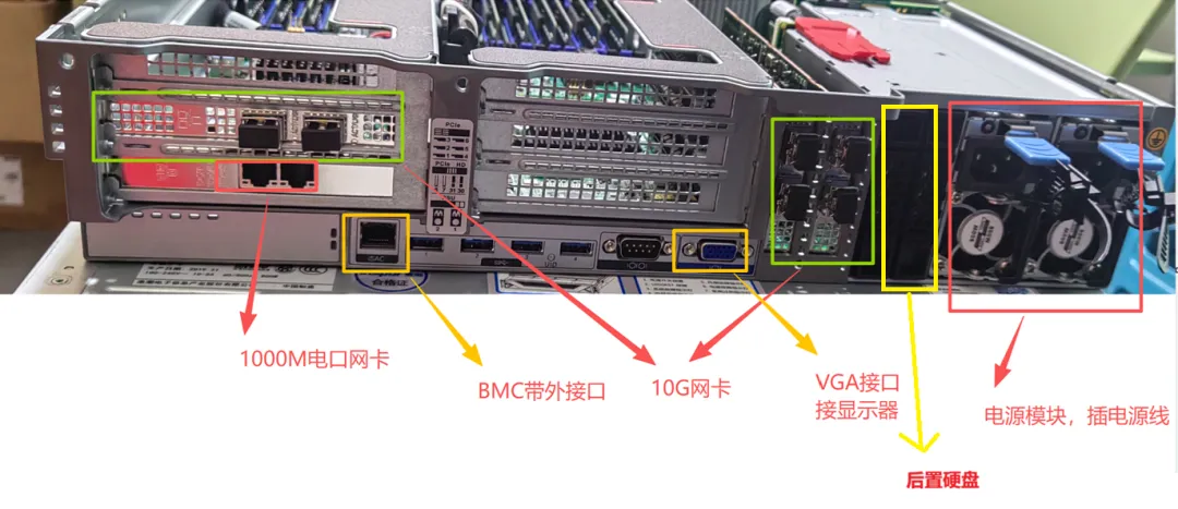 后面板图,1000M、10G网口(电网&接网线、光口&接光线)、BMC接口、USB接口、VGA接口(接显示器)、电源模块、后置硬盘: