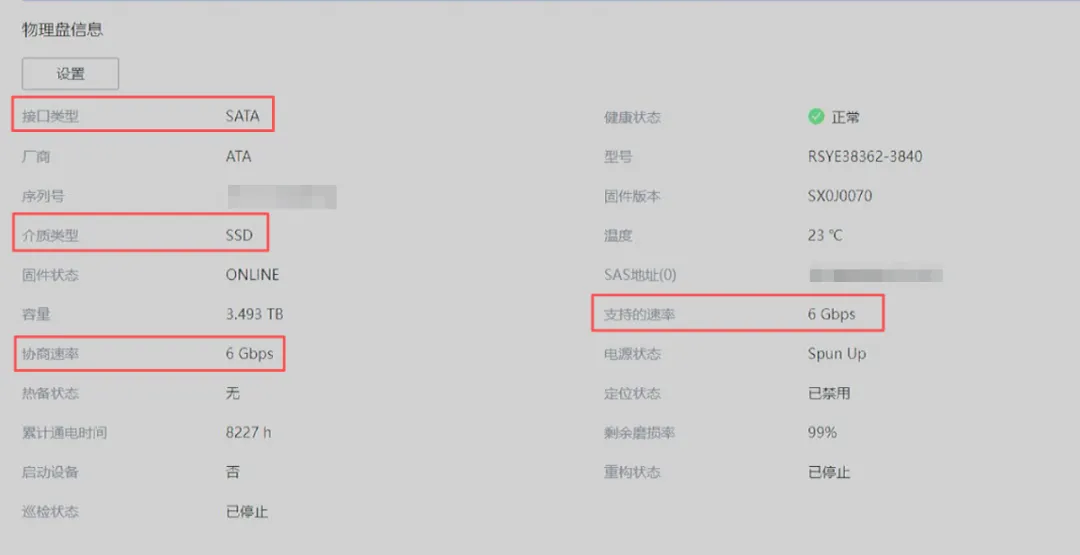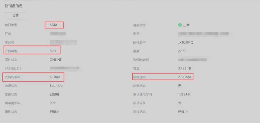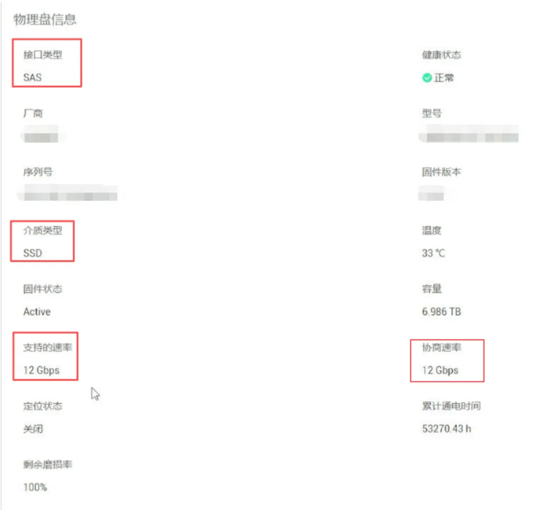 下图是一张 SAS接口的SSD硬件信息图,从图中可以看到支持的速率为12G,协商速率也为12G