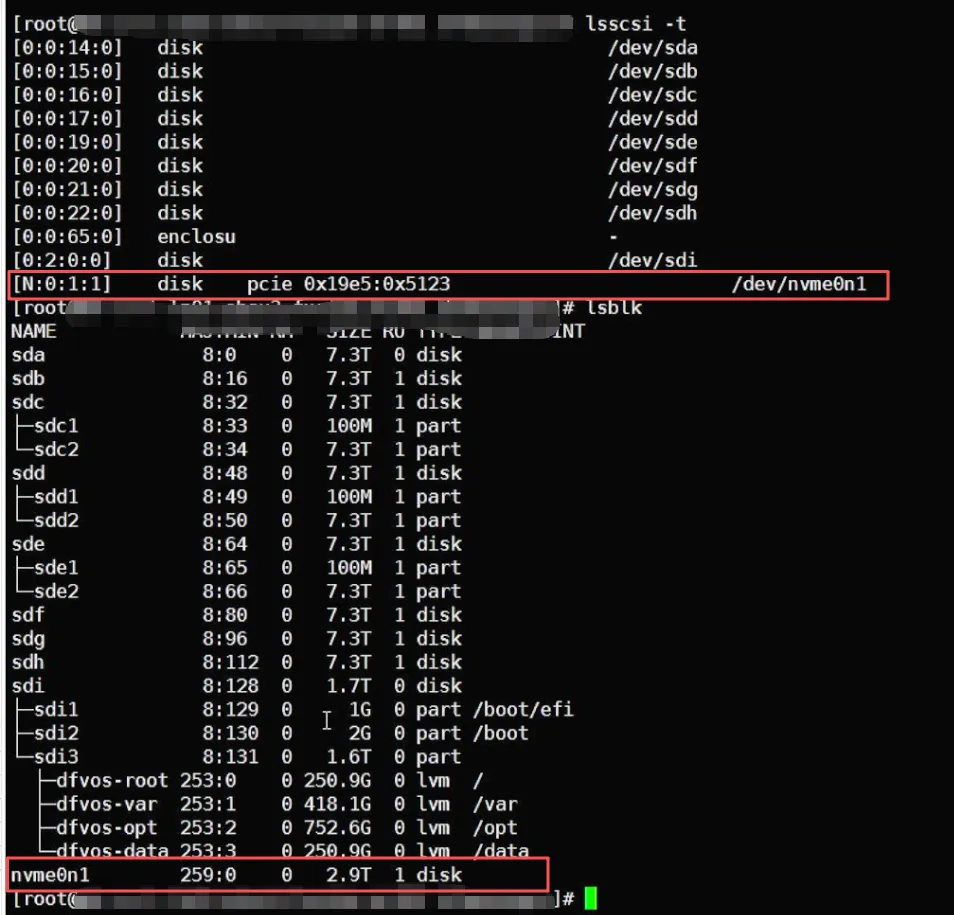 lsscsi -t 命令结果中有/nvme0n1 接口是pcie, lsblk命令也可看到nvme设备