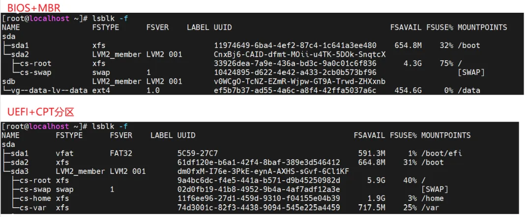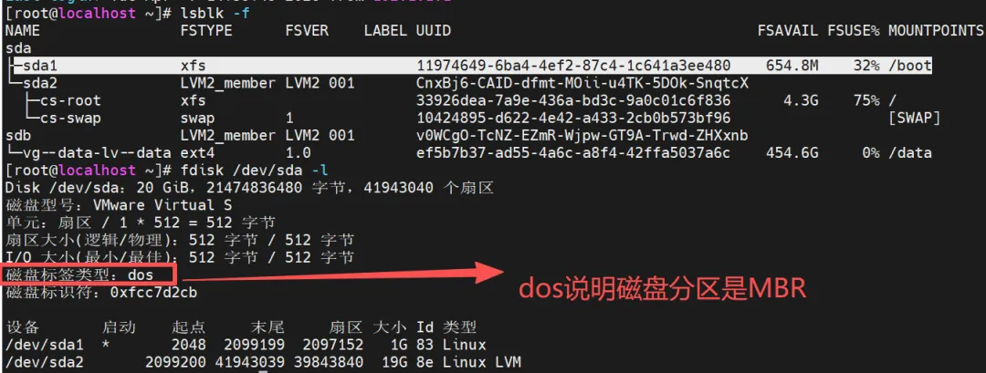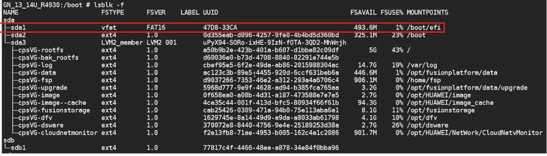 MBR分区下的lsblk -f 命令结果,可以看到/boot挂载在第一个分区上。