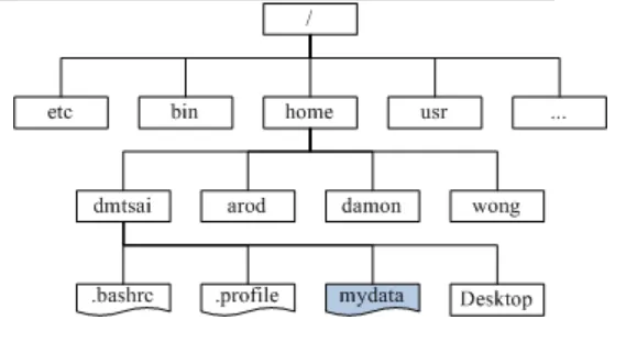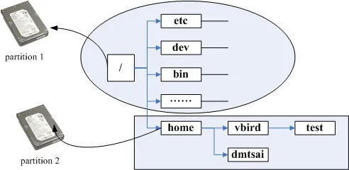 上图中假设我的硬盘分为两区,partition 1是挂载到根目录,至于partition 2则是挂载到/home这个目录。 这也就是说,当我的数据放置在/home内的各次目录时,数据是放置到partition 2的,如果不是放在/home底下的目录, 那么数据就会被放置到partition1了。