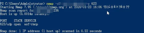 使用nmap测试服务器BMC地址的623端口返回截图如下: