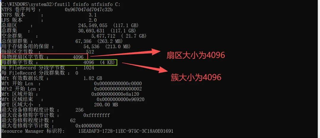 fsutil fsinfo ntfsinfo C:命令中其中C为盘符,下图为命令截图: