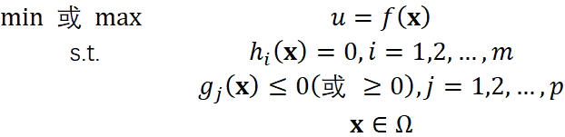设决策变量为 x=(x_1,x_2,…,x_n )^⊤,目标函数为 f(x),约束条件由等式 h_i (x)=0与不等式 g_j (x)≤0(或 ≥0)构成,可行域为 Ω。规划模型的通用数学表达为: