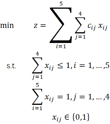 for j in range(4):prob += pulp.lpSum(x[(i, j)] for i in range(5)) == 1