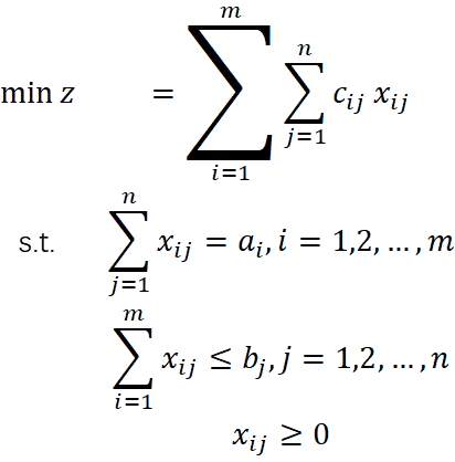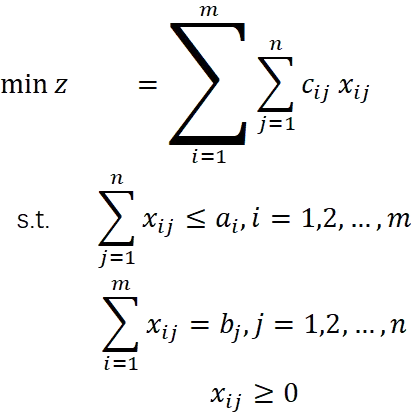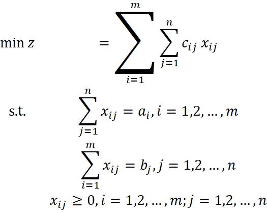 设某种物资共有 m个产地 A_1,A_2,…,A_m,各产地的产量分别是 a_1,a_2,…,a_m;有 n个销地 B_1,B_2,…,B_n,各销地的销量分别为 b_1,b_2,…,b_n。假定从产地 A_i (i=1,2,…,m)向销地 B_j (j=1,2,…,n)运输单位物资的运价是 c_ij,问怎样调运才能使总运费最小?