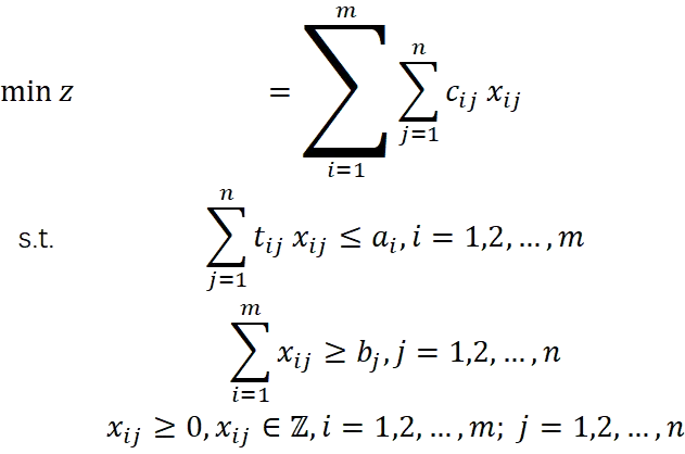 工厂用 m种设备 A_1,A_2,…,A_m生产 n种产品 B_1,B_2,…,B_n。在一个生产周期内,已知第 i台设备 A_i只能工作 a_i个机时。工厂必须完成产品 B_j至少 b_j件,设备 A_i生产产品 B_j所需要的机时和成本分别为 t_ij,c_ij。试建立相应的数学模型,使设备能在计划周期内完成计划但又使成本达到最低。