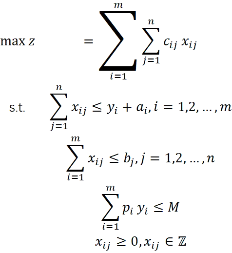 工厂需要 m种设备 A_1,A_2,…,A_m,设备 A_i的单价为 p_i,工厂已有第 i种设备 a_i台。现有资金 M元可用于购置这些设备。该厂有 n处可安装这些设备,B_j 处最多可安装 b_j台。将一台设备 A_i安装在 B_j处的经济效益为 c_ij元。问应如何购置和安装这些设备,才能使总的经济效益最高。