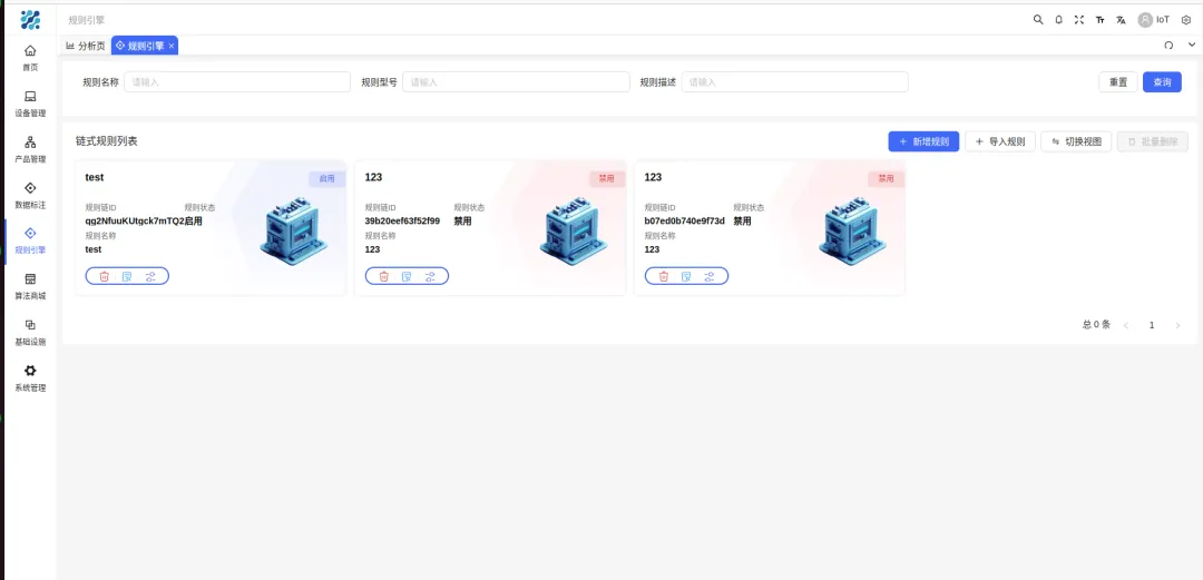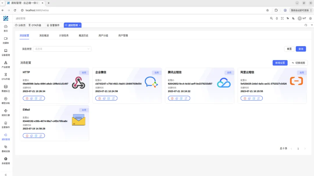 全生命周期:从设备注册、认证到状态监控、下线,全流程可视化管理。多协议兼容:MQTT、TCP、HTTP 统统支持,异构设备统一接入。规则引擎:数据流转、消息路由、设备联动,逻辑配置化,不用写死代码。告警必达:飞书、钉钉、企微、短信、邮件等7种通知方式,重要告警绝不漏过。