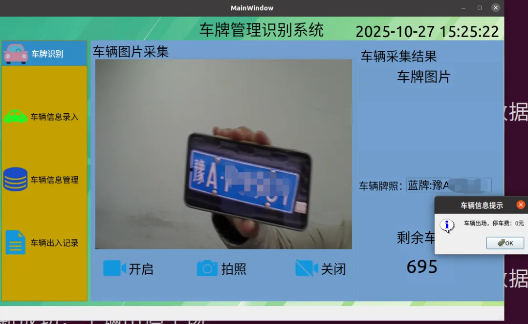 该系统适用于小区停车场管理、路边停车计费、单位门禁车辆登记等场景,所有识别逻辑在 Linux 本地完成,无需依赖云端服务,同时通过 Qt 构建直观操作界面,支持实时预览、识别结果展示、记录查询导出,兼顾技术实用性与用户体验,具有显著的落地价值与推广前景。