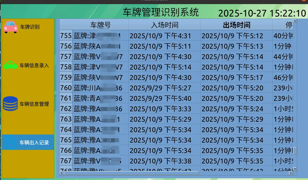 (3)识别记录管理:自动记录每次识别的车牌号码、识别时间、置信度、拍摄图像路径,存储于本地数据库,支持按时间、车牌号码检索记录。