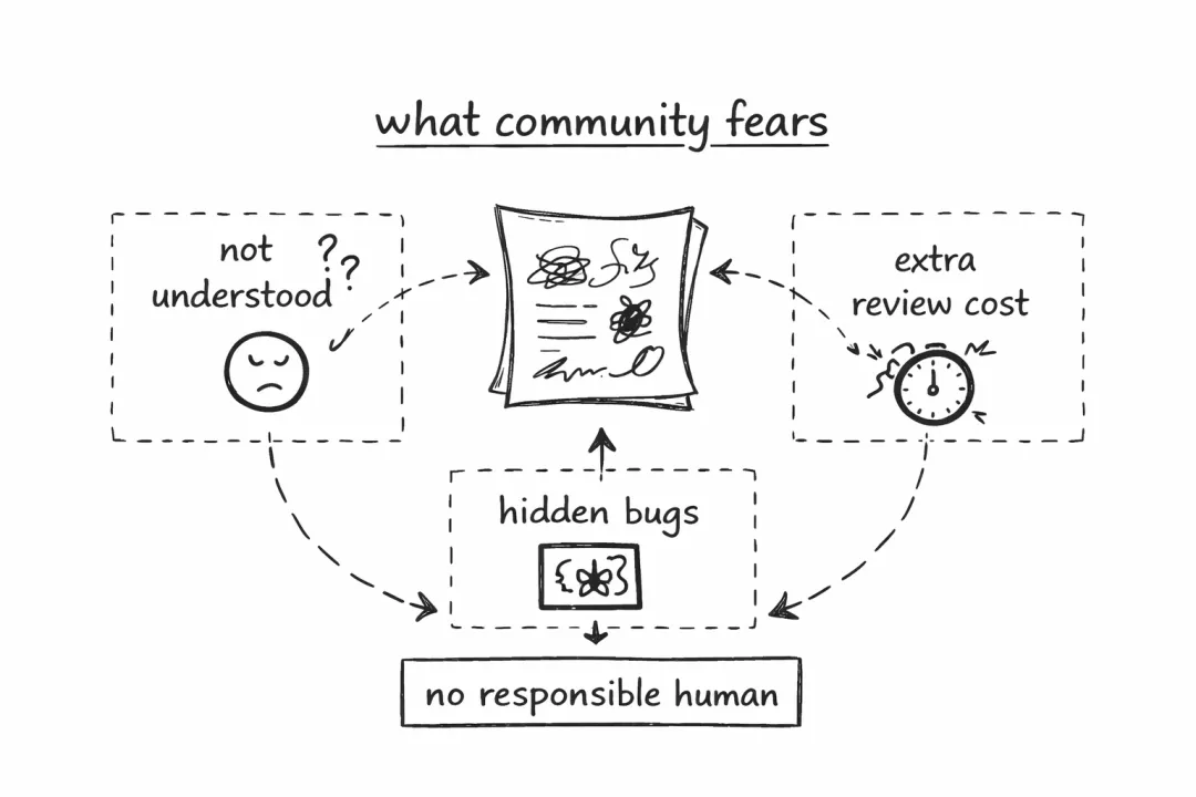 因为一个社区真正害怕的,从来不是“有人用了 AI”。社区怕的是下面这几件事: