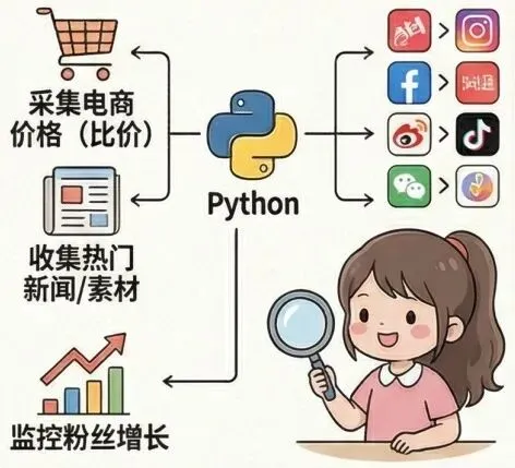 采集素材、比价、订单数据、粉丝增长。入门快,需求稳,值得关注。