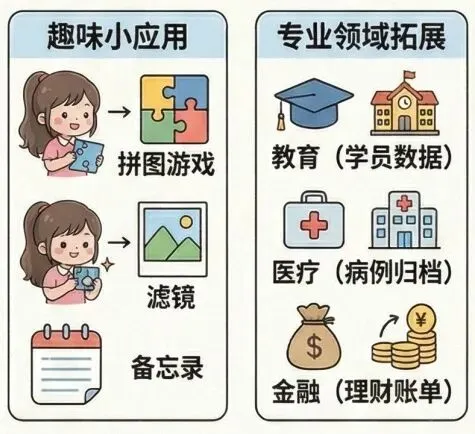 制作趣味游戏、工具,或处理专业行业数据,成为技术人才。