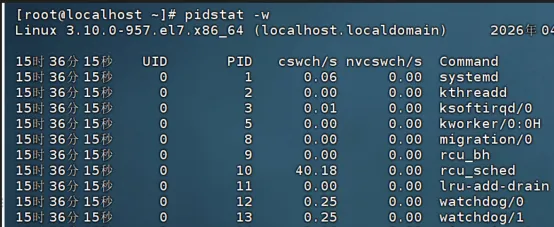(2)查看上下文切换,重点关注cswch/s和vncswch/s这两列数值,执行指令: