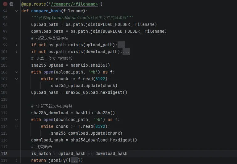 • 前端:HTML表单(上传/下载按钮)+ 哈希对比结果显示
