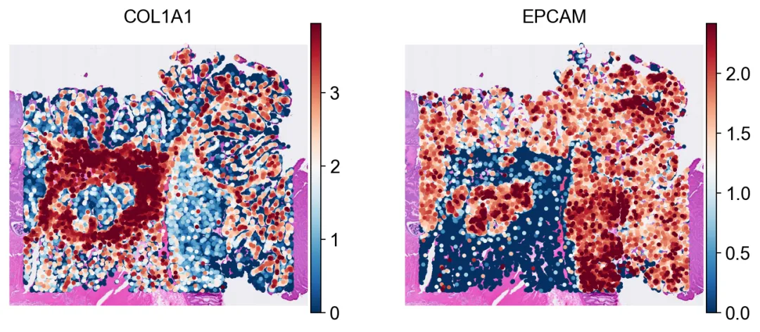 把两套分割结果聚合成细胞级表达后,可以在同一种空间视图里直接比较。参考文献:Polański, K., Bartolomé-Casado, R., Sarropoulos, I., Xu, C., England, N., Jahnsen, F. L., ... & Yayon, N. (2024). Bin2cell reconstructs cells from high resolution Visium HD data. Bioinformatics, 40(9), btae546.
