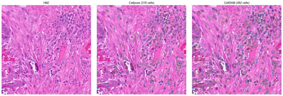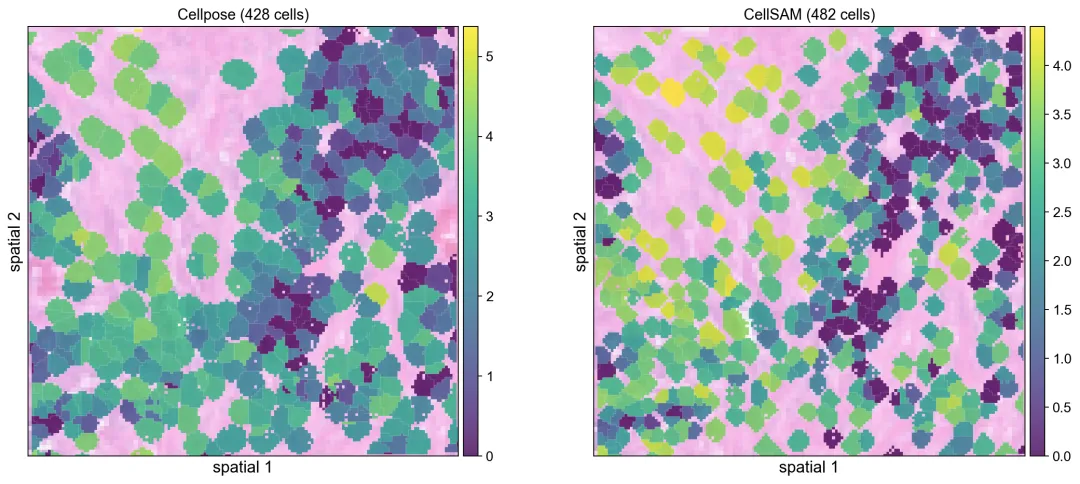 在同一块组织裁剪区域上比较 Cellpose 与 CellSAM 的分割轮廓。细胞级空间对比