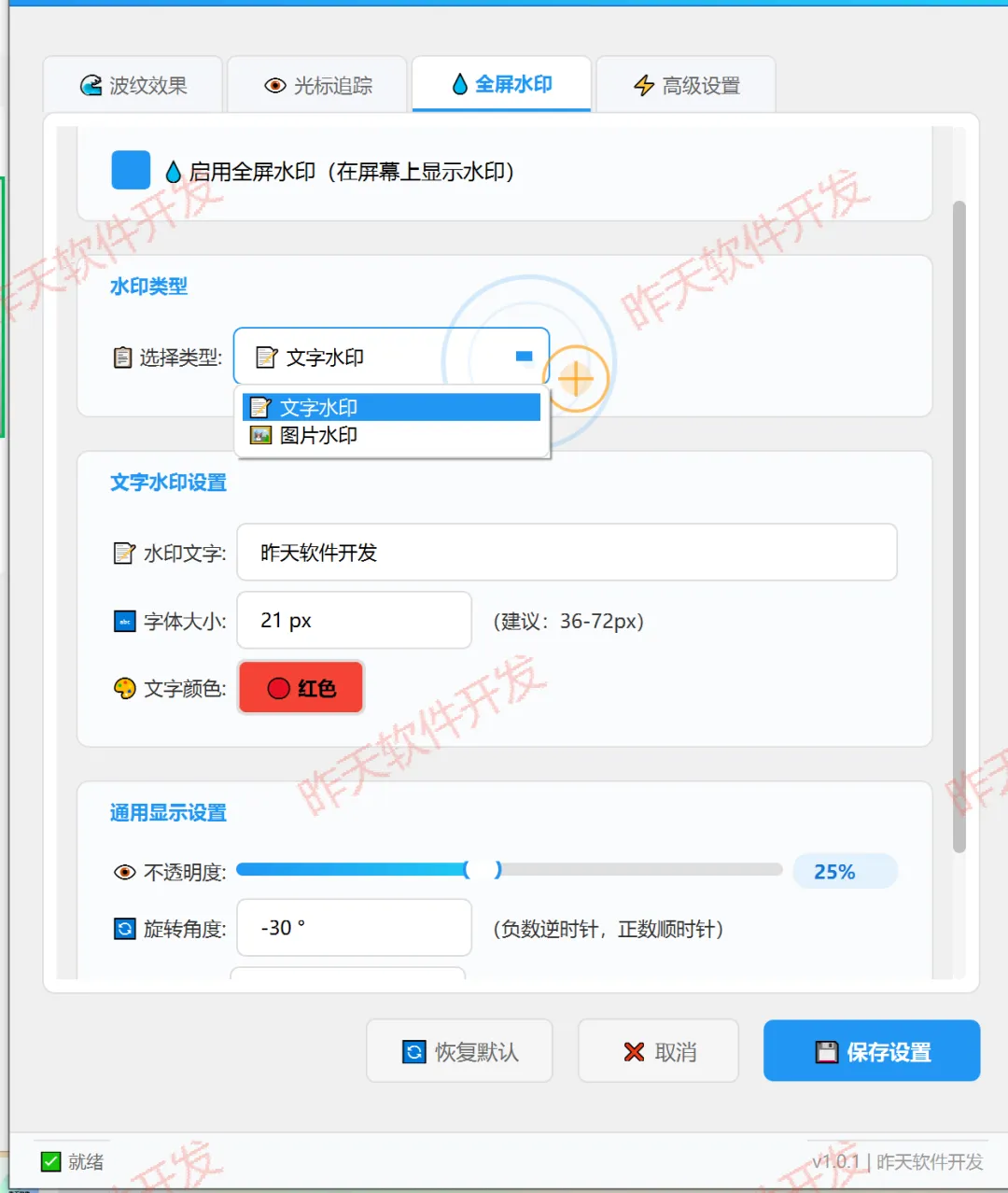【文字水印自定义】可自由编辑水印文字内容,调节字体大小、颜色、透明度与旋转角度,角度范围覆盖-180°~180°,同时设置水印间距,打造专属全屏文字水印,既不影响观看,又能起到防护作用。