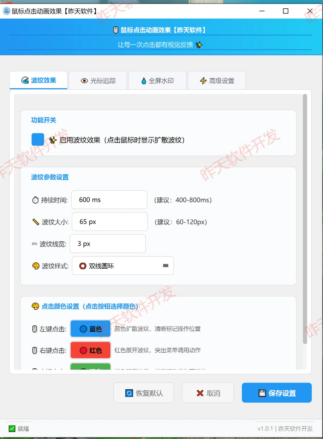 在日常办公、教学演示、远程协作或录屏制作中,你是否常常遇到鼠标光标难以快速定位、点击操作不够醒目、屏幕内容需要安全防护等问题?这款由昨天软件精心打造的鼠标点击动画效果工具,基于PyQt5深度开发,集炫酷波纹特效、精准光标追踪、全屏水印保护于一体,完美适配各类使用场景,不仅让鼠标操作直观可见,更兼顾实用性与美观度,全面提升你的使用体验。