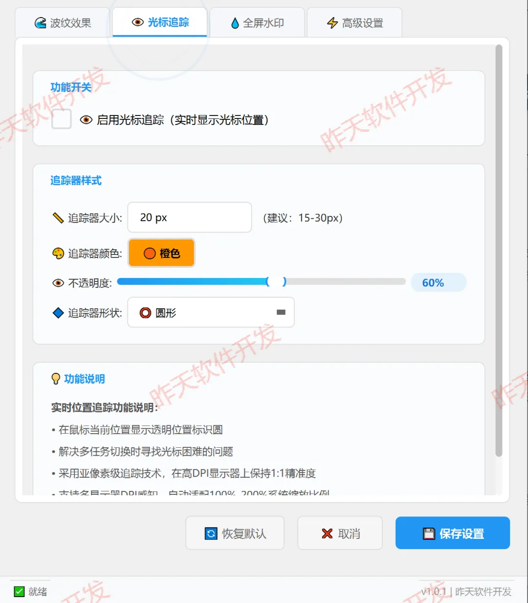 【自定义追踪参数】可自由调节追踪器大小、颜色与不透明度,透明化设计不遮挡屏幕内容,既保证辨识度,又不影响正常办公与操作,兼顾实用性与美观性。