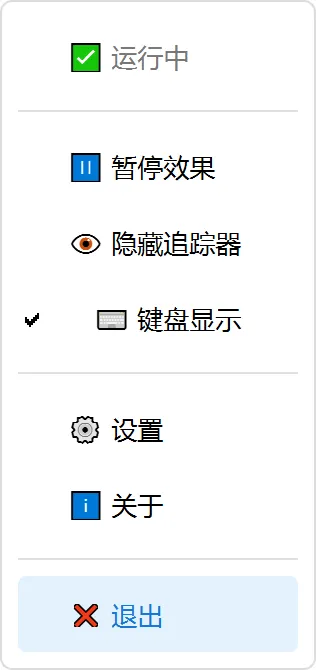 【系统托盘便捷操控】软件启动后最小化至系统托盘,显示专属鼠标图标,不占用任务栏空间;双击托盘图标快速打开设置,右键菜单可一键暂停/恢复效果、查看软件信息,操作极简高效。