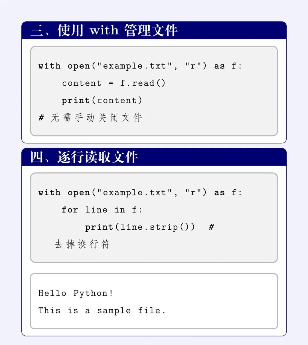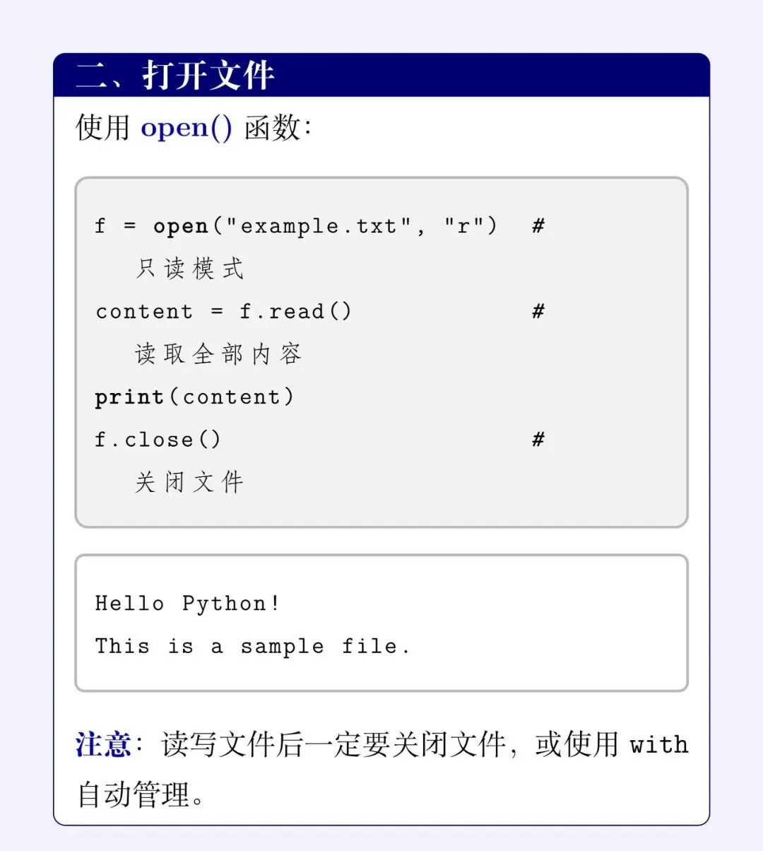 # 1. 打开文件("r" 代表 read,只读模式)f = open("example.txt", "r") # 2. 读取全部内容content = f.read() print(content)# 3. 关闭文件(极其重要!)f.close()