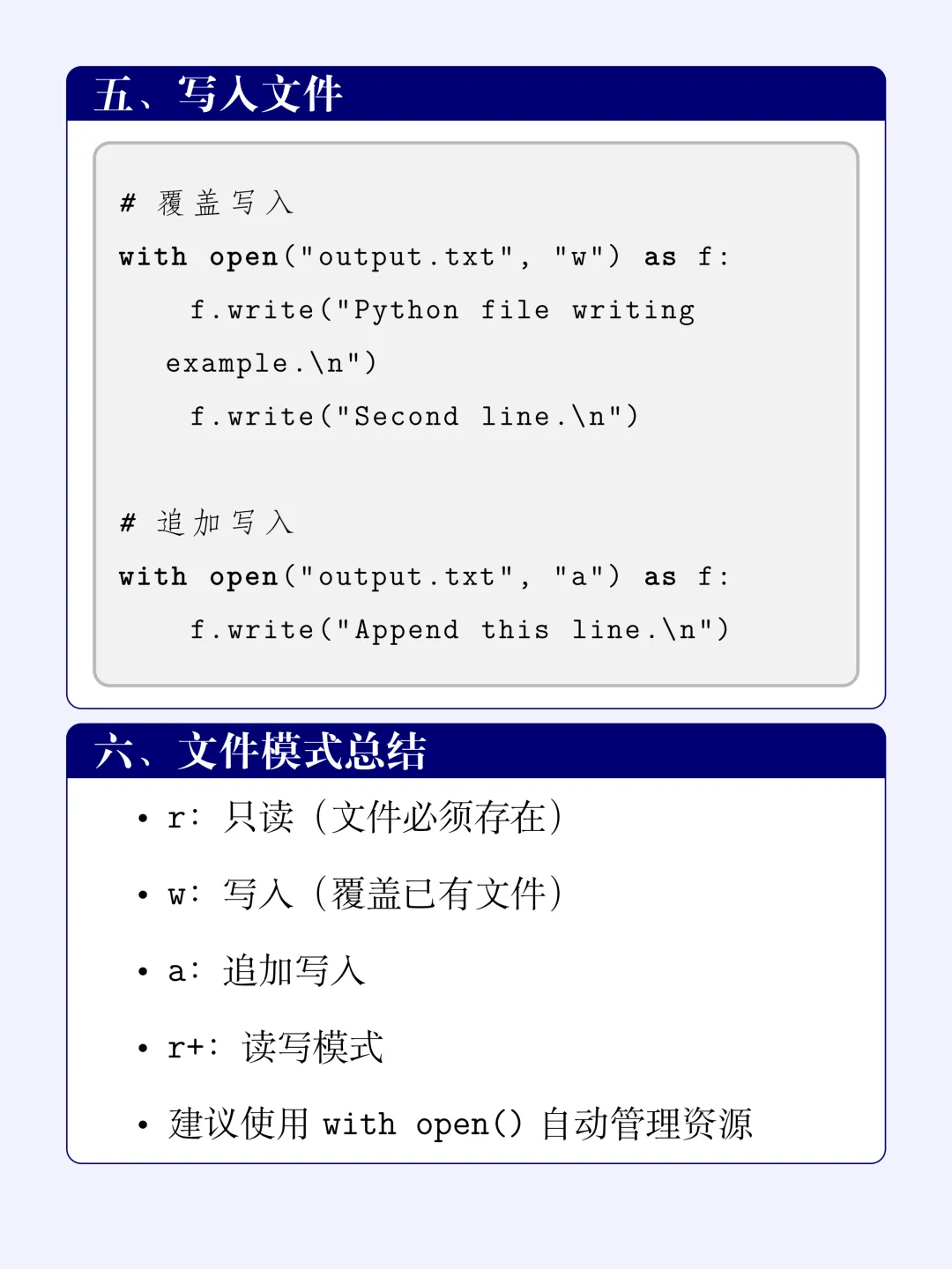 读写策略:大文件记得用 for 循环逐行遍历;写文件时要分清是覆盖(w)还是追加(a)。