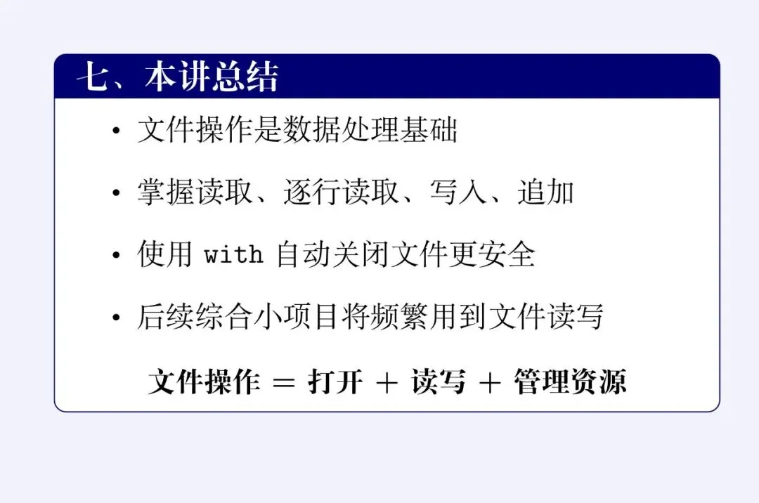 掌握了文件读写,你的 Python 程序终于拥有了“长期记忆”。接下来的项目里,我们就可以拿真实的本地数据来大显身手啦!