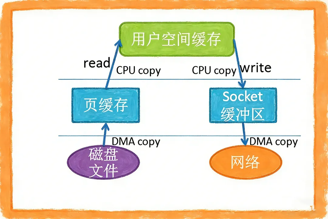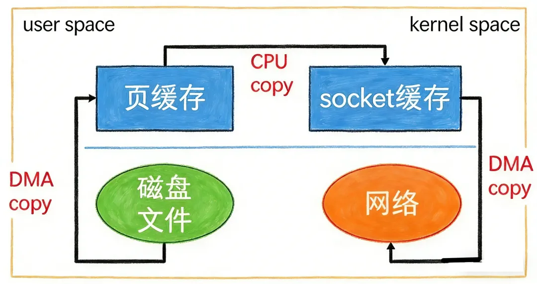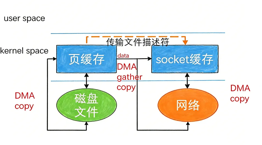 具体过程如下:首先,磁盘数据通过 DMA(Direct Memory Access,直接内存访问)被拷贝到内核缓冲区,也就是页缓存;然后,内核直接将页缓存中的数据描述符(包含内存地址和长度等信息)传递给 socket 缓冲区;最后,网卡的 DMA 控制器根据这些描述符直接从内核缓冲区读取数据并发送出去。
