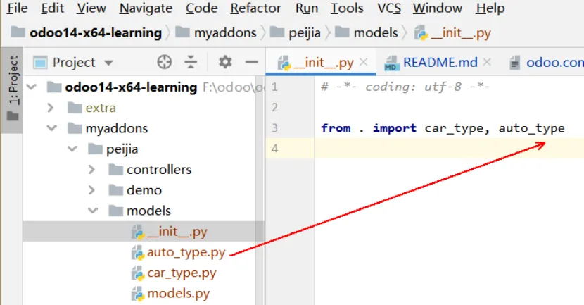在peijia->models目录下新增auto_tpe.py数据模型文件,因初始化时直接载入,且不能修改,所以结构简单,代码如下:from odoo import fields, modelsclass AutoType(models.Model): _name = "nebula.auto.type" _description = "车辆排档类型" _order = 'name' name = fields.Char('类型编码', size=2, index=True) name_type = fields.Char('类型名称')