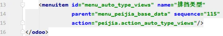 修改peijia目录下__manifest__.py文件中data段,在views/car_type_views.xml前新增views/auto_type_views.xml文件名。在peijia->views目录下car_views.xml文件,前添加菜单指向排档模块,代码:<menuitem id="menu_auto_type_views" name="排挡类型" parent="menu_peijia_base_data" sequence="115" action="peijia.action_auto_type_views"/>