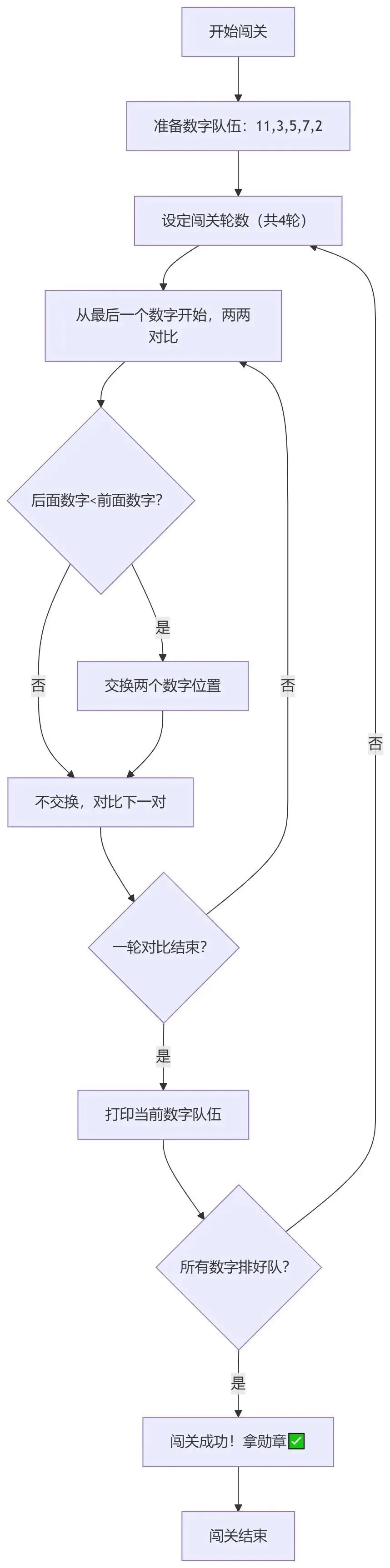 # 1. 准备乱作一团的数字队伍(闯关素材)number_line = [11, 3, 5, 7, 2]print("闯关开始!初始队伍:", number_line)# 2. 编写冒泡排序魔法(核心函数)def bubble(team): # 魔法轮数:队伍有5个数字,需要4轮(每轮排好1个小数) round = len(team) - 1 # len(队伍)表示队伍里数字的个数 # 每一轮闯关 for i in range(round): # 每一轮从最后一个数字开始,两两对比(已排好的跳过) for j in range(round - i): # 对比相邻两个数字:后面的数字 > 前面的数字? if team[j] > team[j+1]: # 交换位置(小数在前,大数在后) team[j], team[j+1] = team[j+1], team[j] # 打印每一轮闯关后的队伍,看看变化 print(f"第{i+1}轮闯关后:", team)# 3. 施展魔法,帮数字队伍排队bubble(number_line)# 4. 闯关成功,打印最终整齐的队伍print("🎉 闯关成功!最终整齐的队伍:", number_line)