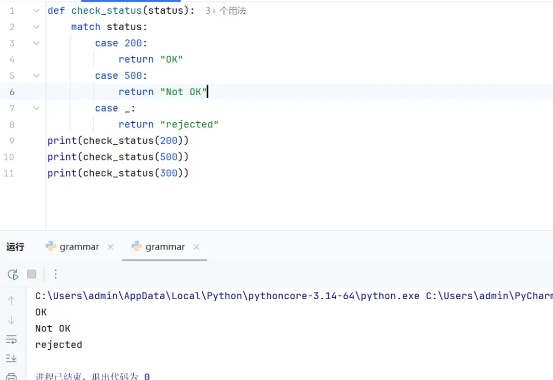 match 后的对象会依次与 case 后的内容进行匹配,如果匹配成功,则执行匹配到的表达式,否则跳过。