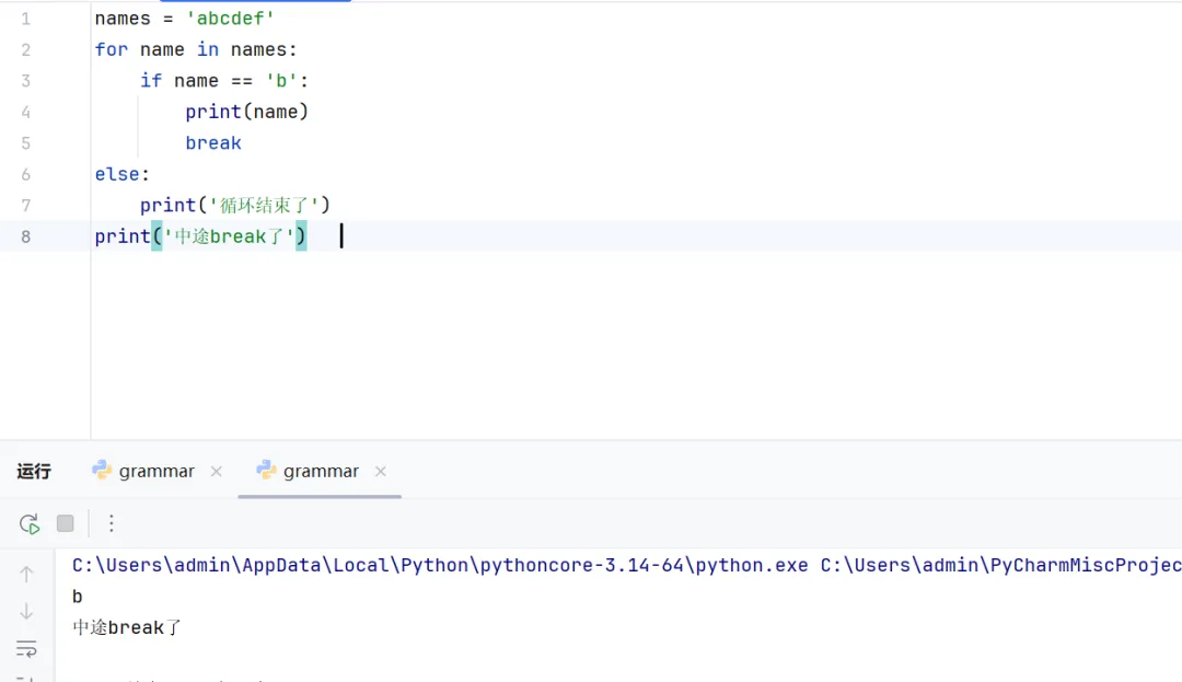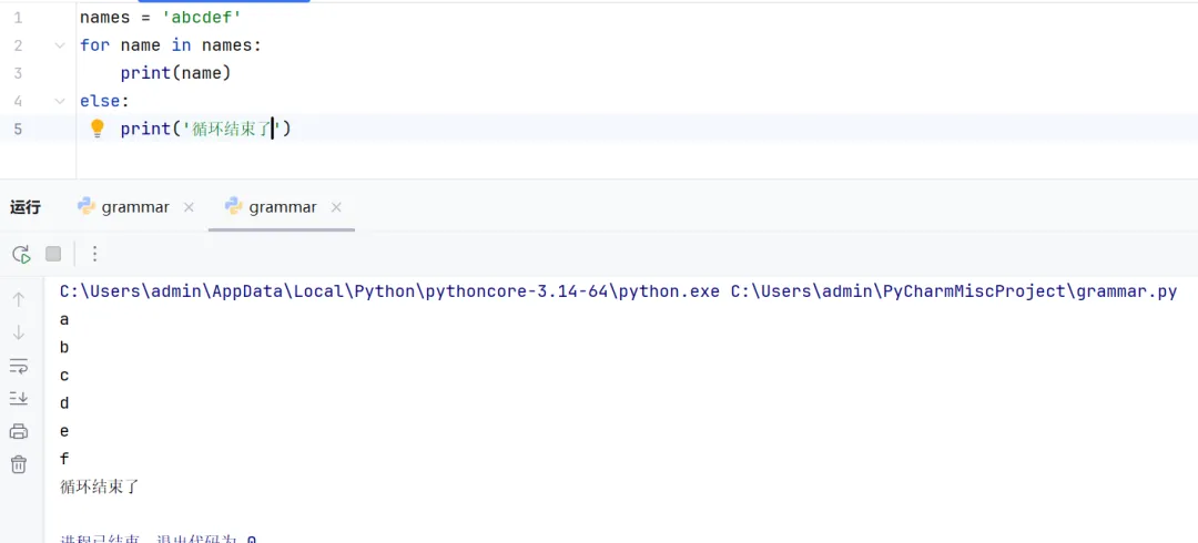 for else:用于在循环结束后执行一段代码,一定要遍历完所有元素,中途遇到break语句,则不会执行else子句