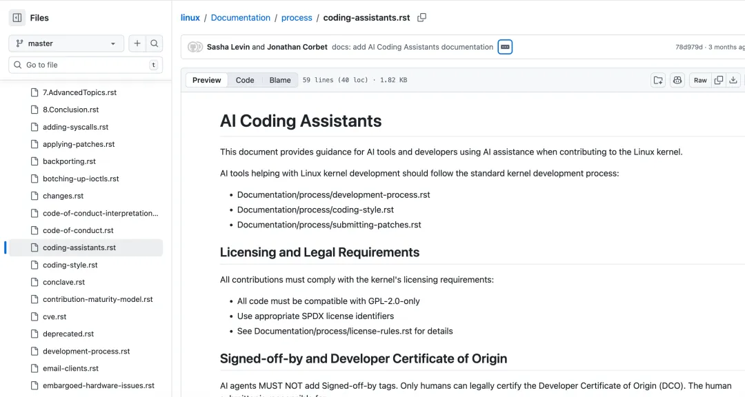 一份新增到 Linux 内核的文档 Documentation/process/coding-assistants.rst,对规则做了简单说明。核心要求是:AI 参与生成的代码不能使用具有法律意义的 Signed-off-by 标签,而要改用新的 Assisted-by 标签,用来标明所使用的 AI Agent、模型版本以及相关辅助工具,例如 Assisted-by: Claude:claude-3-opus coccinelle sparse。