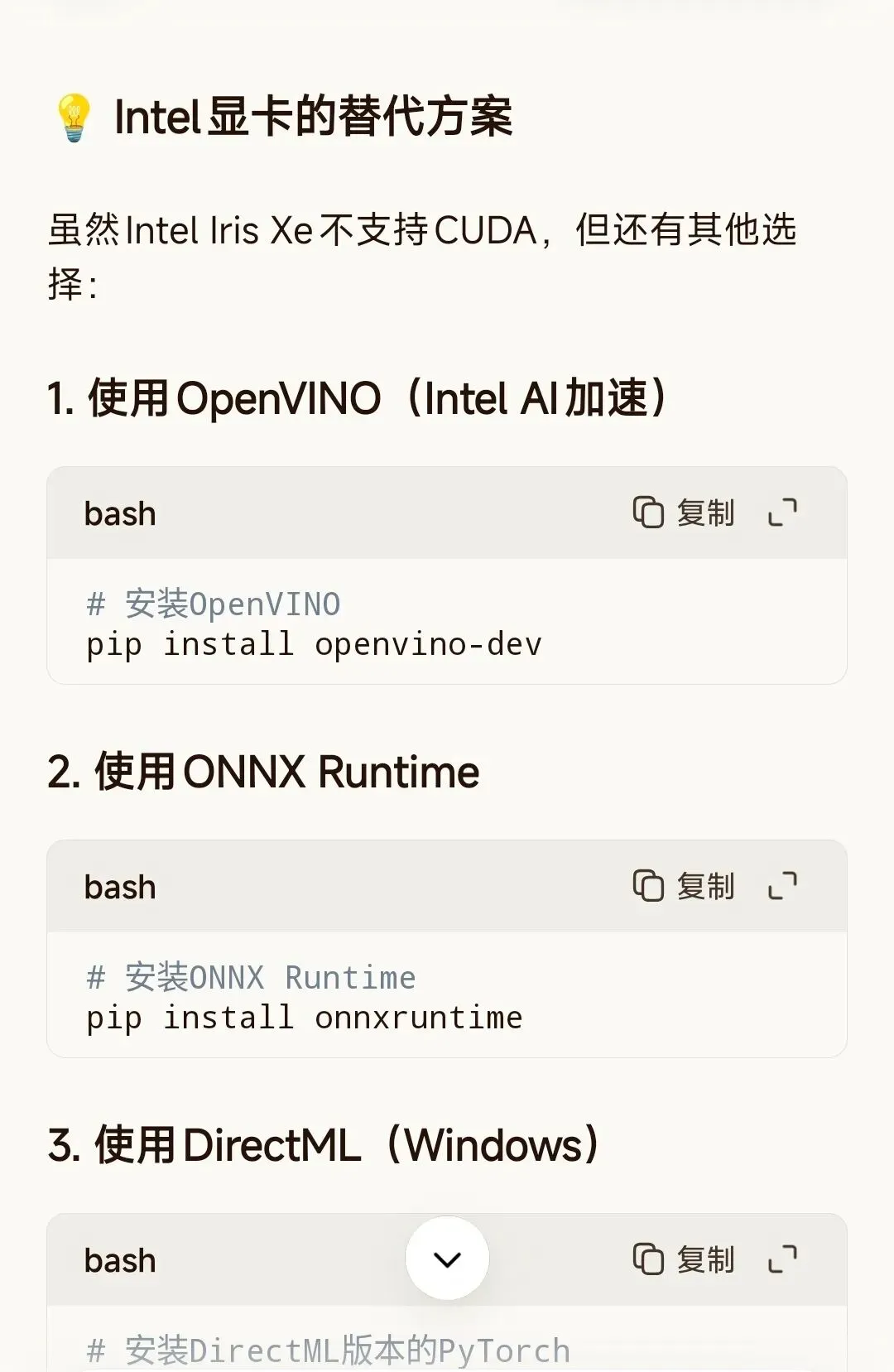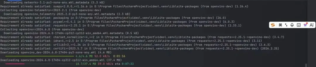 然后自己去下载PyTorch,刚开始又是网络很慢,后面下载了国内镜像,下载好后,发现电脑没有独立显卡,这样生图会很慢,需要走CPU生图,不过有Intel集成显卡性能加速替代方案,目前在下载OpenVINO。