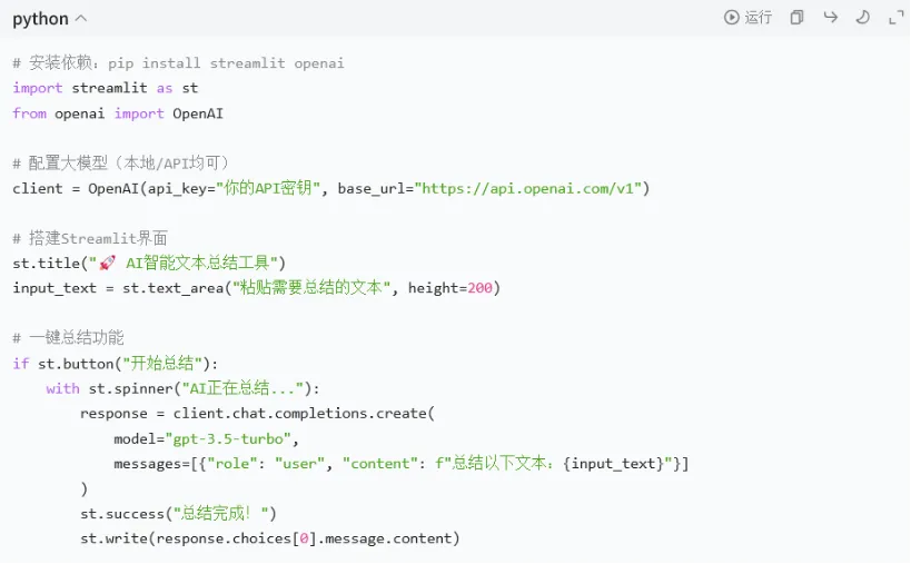 传统 AI 开发要搭复杂环境、调参、写前端,新手折腾半个月都跑不通demo。但轻量化 AI 开发彻底颠覆这一切——不用懂复杂架构,不用写 HTML/CSS,Python+2 个神器,30 行代码就能做出可交互的AI 工具。