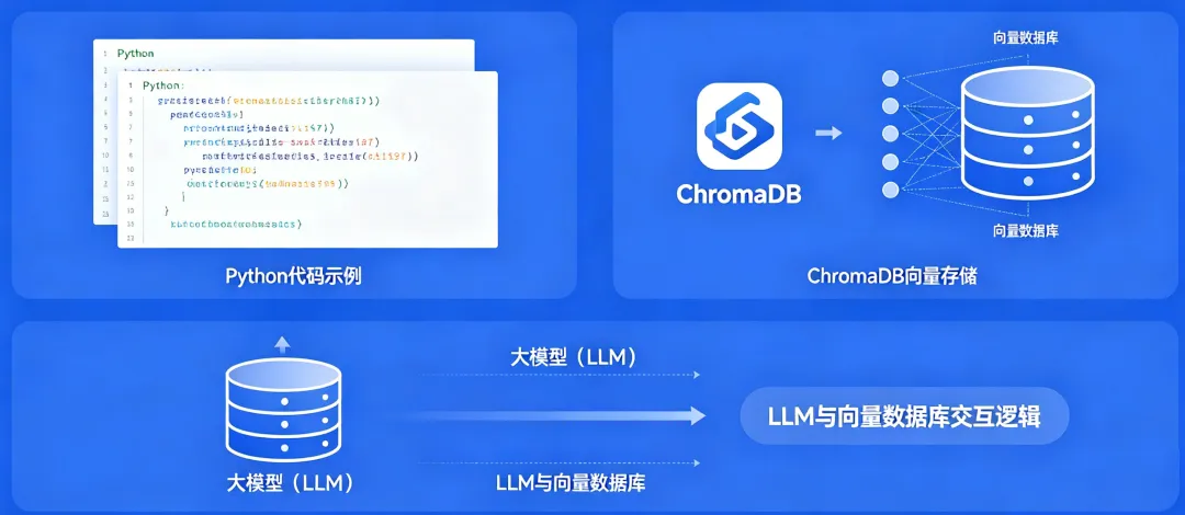 当你掌握了这四步:初始化 -> 建集合 -> 入库向量化 -> 相似度检索,你就已经踏入了现代 AI RAG 架构的大门了。如果我们要接上大语言模型,只需要把查出来的这两句话组装进提示词里丢给 GPT 或者 DeepSeek,它们就能根据你本地的资料做智能回答了!