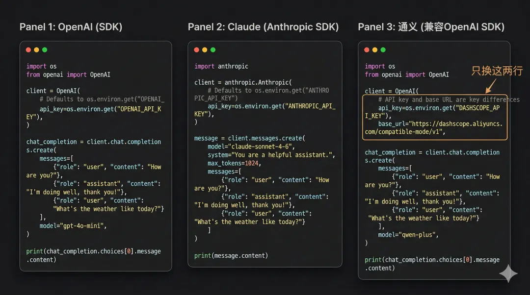 OpenAI 是行业标准,其他很多模型都兼容它的 API 格式。