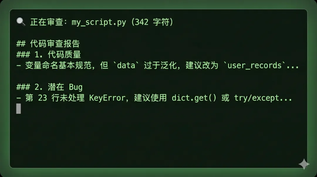 print(f"🔍 正在审查:{filepath}({len(code)} 字符)\n")
