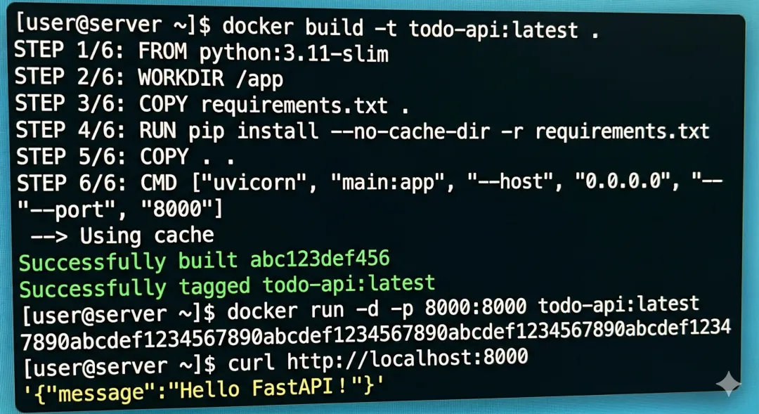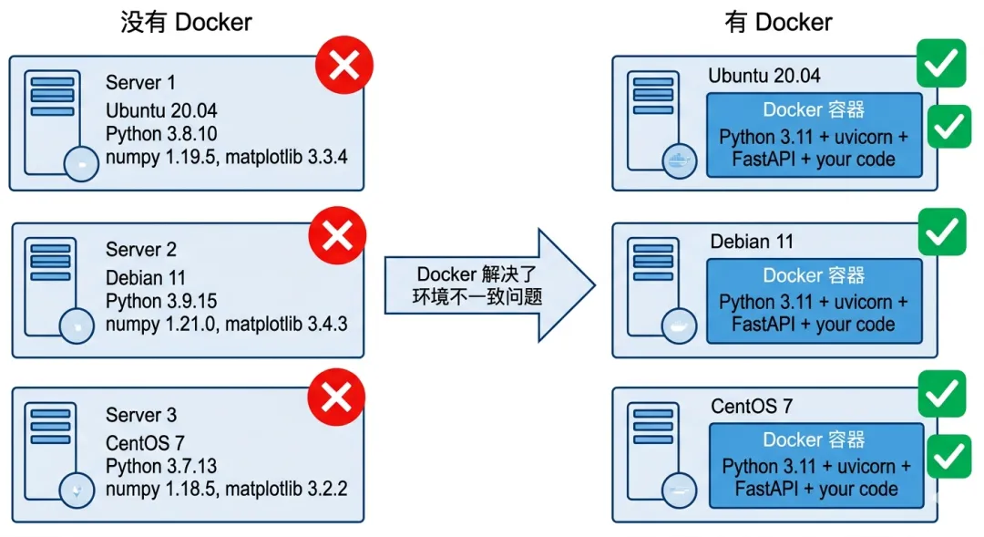 Docker 解决了"在我电脑上能跑"的问题。容器把应用和它需要的所有环境(Python 版本、依赖包、系统库)打包在一起,在任何服务器上行为完全一致。